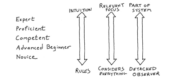 德雷福斯模型(Dreyfus model of skill acquisition),将一个技能的学习程度类比成阶梯式的模型。由上而下分成:专家、精通者、胜任者、高级新手、新手五个等级。 [from wiki]