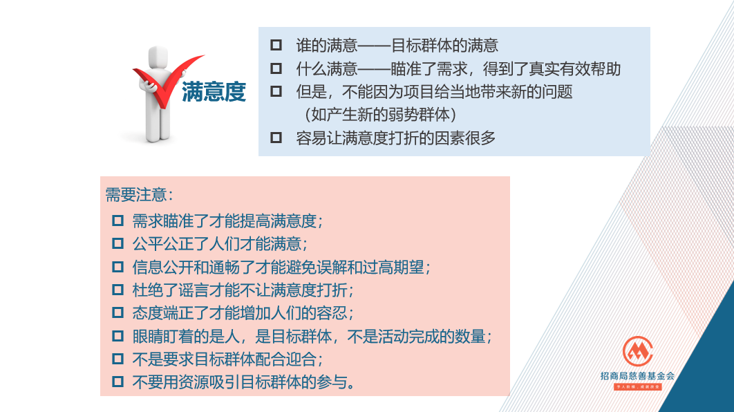 在做项目满意度调查时,我们通常可以收到积极的评价,因为通过我们的项目社区和目标群体多多少少都得到了一些提升和改善。但这还远远不够,里面仍有挺多可能导致不满意的“坑”,我们要更为关注。
