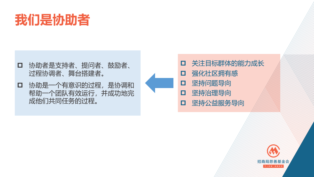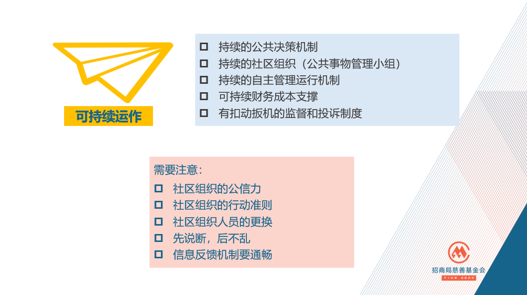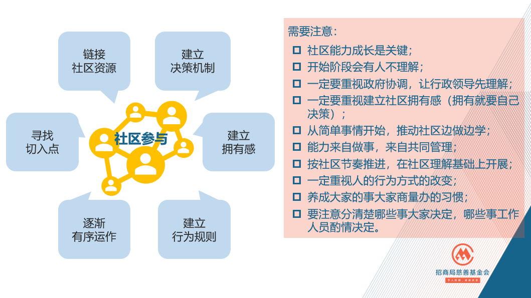 我们在开展社区项目中要注意建立起社区成员协作的行为方式、准则以及社区共同决策的氛围,让社区形成拥有感和自我负责的态度,形成自我管理的能力后,才能长期持续自主管理。