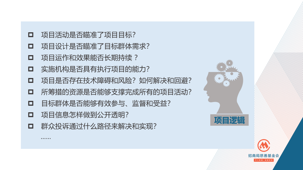 在项目设计中,项目的问题、目标、活动、预算和资源之间要有清晰的逻辑联系。比如,社区需求(显性&隐性)和机构能力要匹配;项目目标要回应社区的需求,并且是具体、可实现的,要与机构能力和项目资源相匹配;要构建起说得通、可操作的路径;项目活动背后要有思路(并且一定要在项目建议书中体现),要贡献于目标达成,等等。