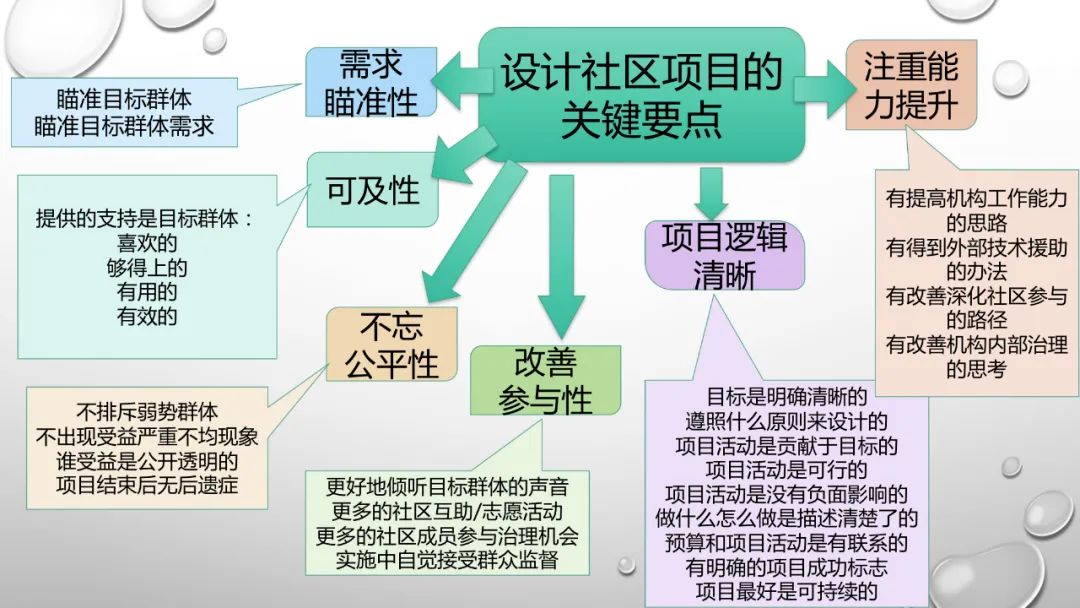 以上就是设计一个社区项目的几个关键要点。希望社会组织在过程中不断提升自身工作能力,跟着一个个资助项目不断往前走,提高自己的专业度和专业能力。