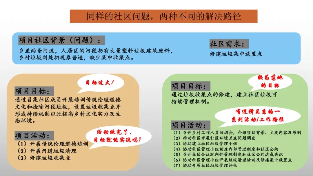 第一种项目活动设计中,培训、开展垃圾清理和修建垃圾池是重点,但活动之间没有链接,没有层层递进向项目目标推进的关系。第二种项目设计活动就是一步步去实现建立社区垃圾可持续性管理机制这个目标。这种项目设计就能够为项目结束之后社区继续做好垃圾管理奠定一个好的社区基础,这也是怎样让社区参与项目活动的一个工作路径。