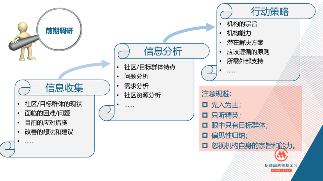 比如一个支持残障人士的项目,如果了解到他们的问题是需要增加收入,就直接设计一个项目来支持他们做手工产品,不一定是个好的设计。**好的社区调研还应该进一步去了解目标群体目前的生计策略、强烈意愿、他们自身的优势和应对办法是什么,目前能力和水平是怎样的,然后基于他们目前状况来设计项目,推动目标群体在原有基础上往前走一步。**但如果我们直接把自已的想法或行动策略“倒灌”到社区,就会忽略本应关注到的一些重要信息,防碍目标群体的想法进入项目设计。
