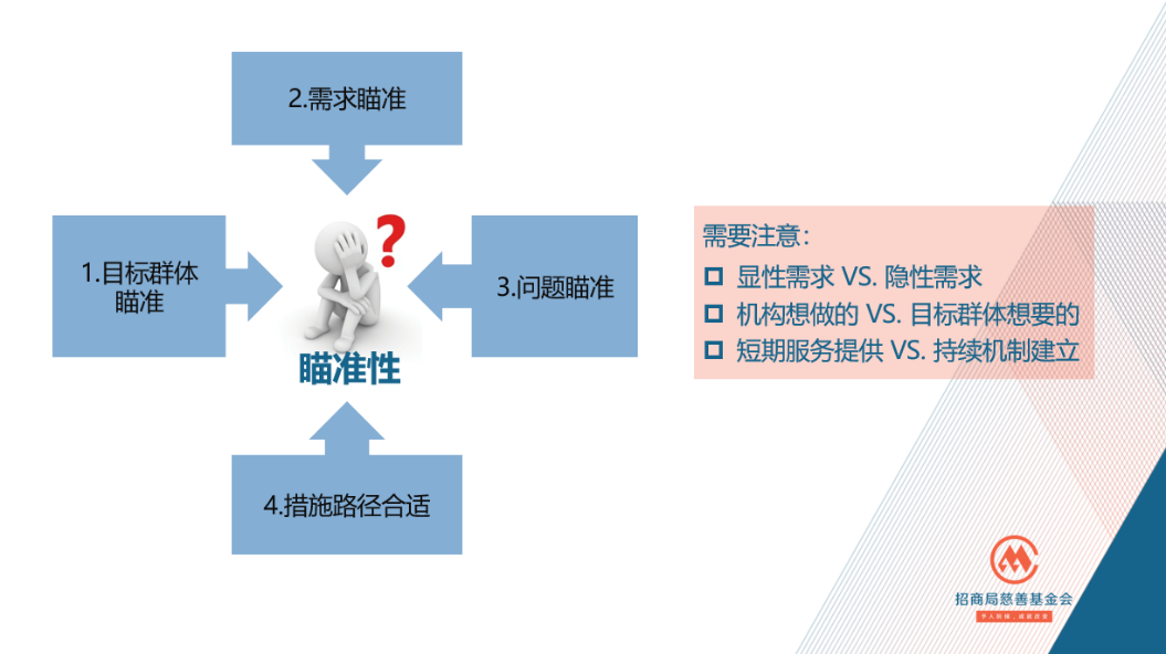有时一个项目让基层政府、资助方、外部机构满意了,但却忽略了目标群体是否满意,这样项目不能算成功。其实,无论是与他人合作实现资助目标的资助机构,还是直接面向社区开展工作的社会组织,抑或者为行业提供支持的技术方,起点虽不同,但我们的工作最终导向的是回应目标群体真实问题,为服务对象带来正向变化。因此视野中要一直有目标群体,关注目标群体的满意度,瞄准他们的真实需求,并提供有效的帮助是前提。