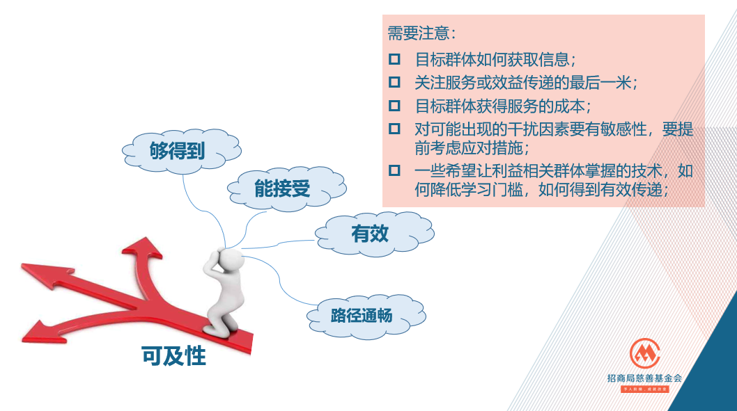 就像公交车提供了防摔拉环,个子矮的人拉不到,够不上,这个防摔拉环的服务对矮个子的人来说就是不可及的。疫情期间很多服务都在线上开展,如心理咨询服务。如果需要心理咨询的目标群体没有网络、没有加入各种群、没有智能手机,那我们在项目设计时就要考虑如何让这部分特殊目标群体及时地获知线上心理咨询服务的信息。类似的,比如针对农村留守儿童进行网络课程支持的项目,也要先去了解这些儿童所在社区的网络、设备情况能否支持该服务。如何构建服务路径去抵达这部分特殊目标群体。这是我们在做项目设计时要考虑的一个关键点。